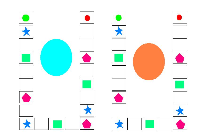 Place your item in the green circle which is in the box. the red circle is you endpoint or destination. You have to roll a 1 or a 6 to start, then roll another number to tell how many spaces you move. You and your friend take turns. If you or your friend lands on a blue star, take one token from the bank. If you land on the sea green square you have to lose one turn. If you land on the pink hexagon you have to take one token away.